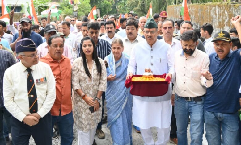 सैनिक कल्याण मंत्री गणेश जोशी ने शहीद के चित्र पर माल्यार्पण कर श्रद्धांजलि अर्पित की, आंगन की पवित्र मिट्टी का ताम्रकलश में किया संग्रहण