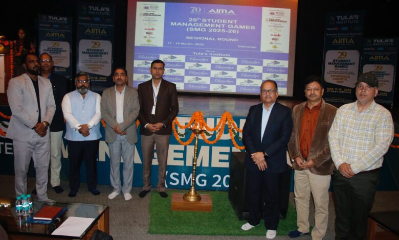 देहरादून : तुलाज़ इंस्टीट्यूट, देहरादून ने हाल ही में तीन दिवसीय एआईएमए स्टूडेंट मैनेजमेंट गेम्स (एसएमजी) रीजनल राउंड 2025–26 का सफल आयोजन किया। इस आयोजन में विभिन्न संस्थानों के छात्रों ने भाग लेकर प्रतिस्पर्धात्मक और ज्ञानवर्धक अनुभव प्राप्त किया। कार्यक्रम की शुरुआत उद्घाटन समारोह के साथ हुई। प्रतियोगिता में 7 संस्थानों की कुल 54 टीमों ने भाग लिया।